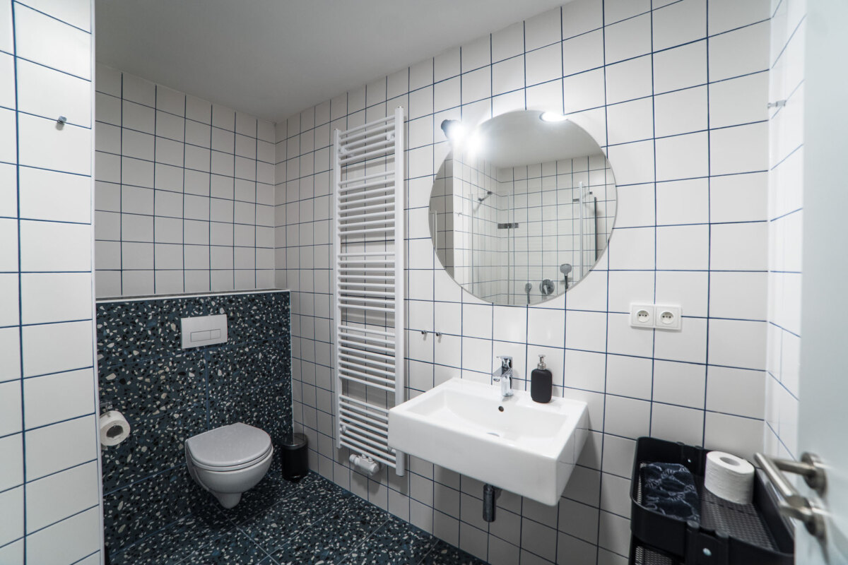 The bathroom is equipped with a sink, toilet, spacious shower corner and storage space for hygiene needs. The washing machine and dryer is available in the house.