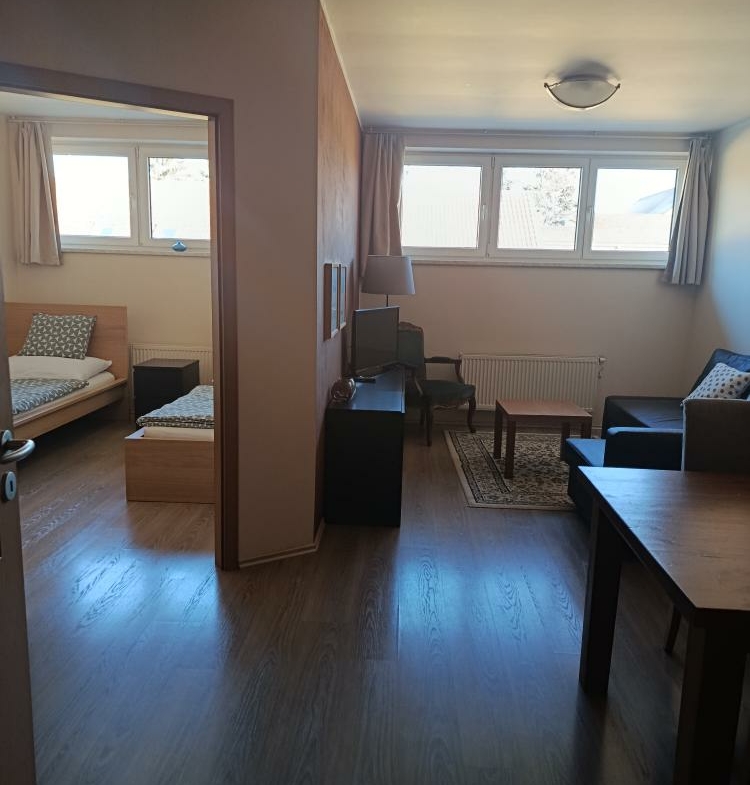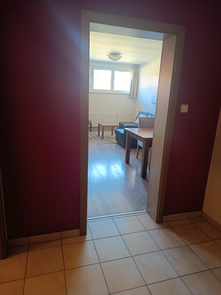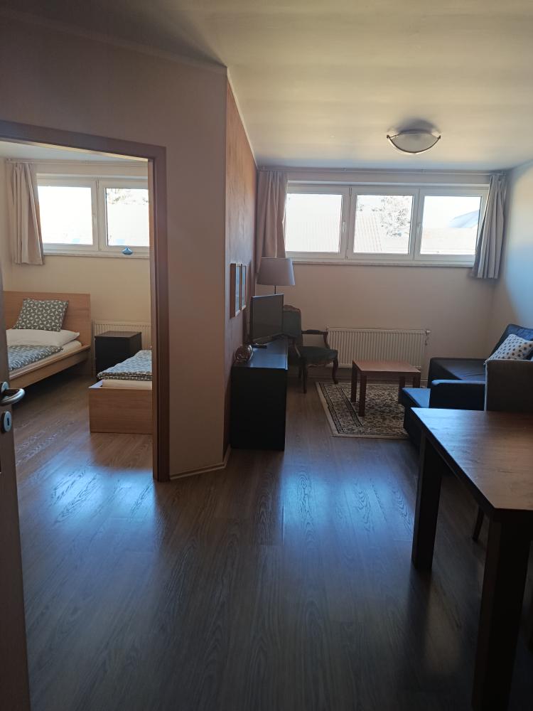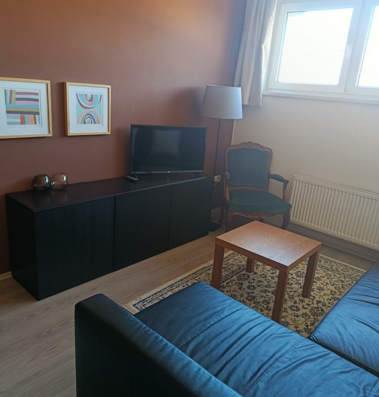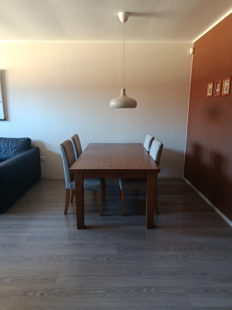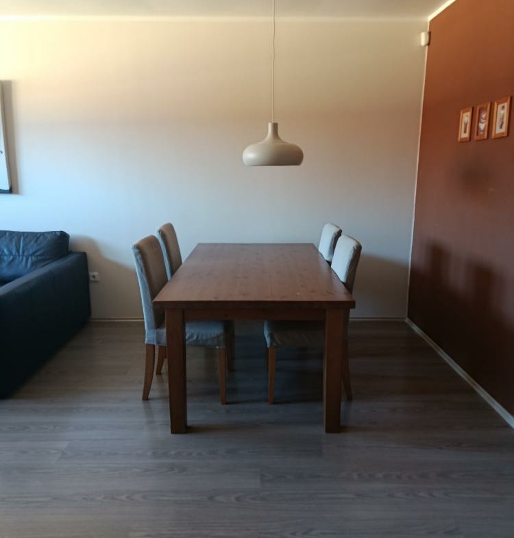 The apartment is offered fully furnished. The kitchen is equipped with a refrigerator, dishwasher, cooktop, and a table with chairs. The living area is furnished with a sofa, coffee table, and a dining table with chairs. In the bedroom, there are two single beds and a wardrobe. The bathroom includes a shower, sink, and washing machine. The toilet is separate. The apartment also has a spacious entrance hall.
