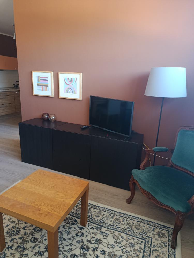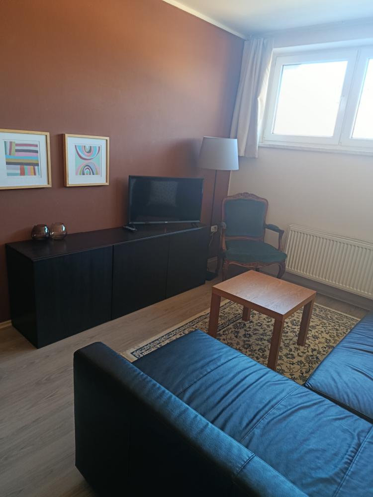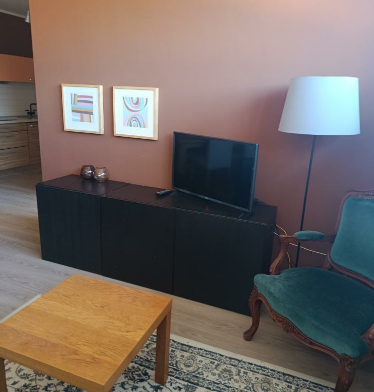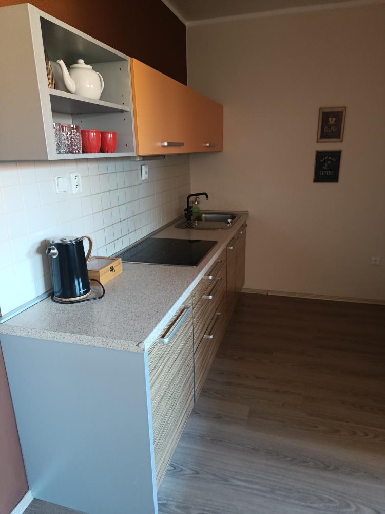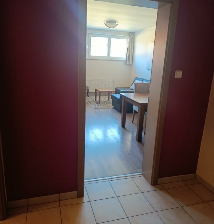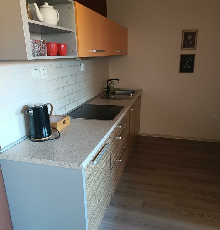 The apartment is offered fully furnished. The kitchen is equipped with a refrigerator, dishwasher, cooktop, and a table with chairs. The living area is furnished with a sofa, coffee table, and a dining table with chairs. In the bedroom, there are two single beds and a wardrobe. The bathroom includes a shower, sink, and washing machine. The toilet is separate. The apartment also has a spacious entrance hall.