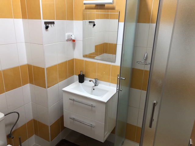 The bathroom is equipped with a sink, toilet and shower corner. The washing machine, dryer, iron and ironing board is available in the house for a fee.