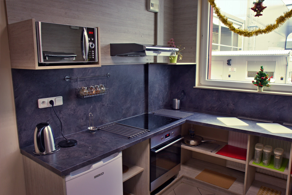 The room has two beds, table with chairs, dresser, small fridge, TV and coffee machine. Enjoy your morning coffee in the comfort of your room. The shared kitchen area has a stove, microwave, fridge, kettle and dining area.
