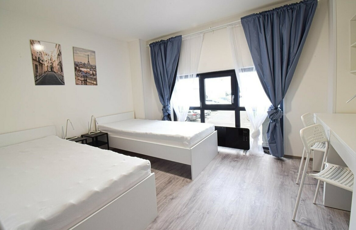 The unit is equipped with two desks with chairs, two comfortable beds and enough space to store clothes. The bathroom is also fully equipped with a wash basin, a toilet and a sink with a mirror. There is preparation for connecting your own washing machine or you can use the common laundries, where there are always washing machines and dryers.